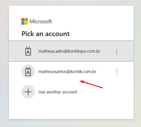 Depois de salvar clique em conectar. Caso tenha mais de uma conta logada no navegador será apresentado a mensagem abaixo: Sempre selecione a conta com o domínio da kontik: kontik.com.br