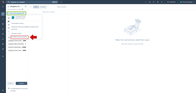 - O consultor deve apenas clicar no botão "Você esta disponível" e no menu suspenso, selecionar a opção "Definir como ausente".